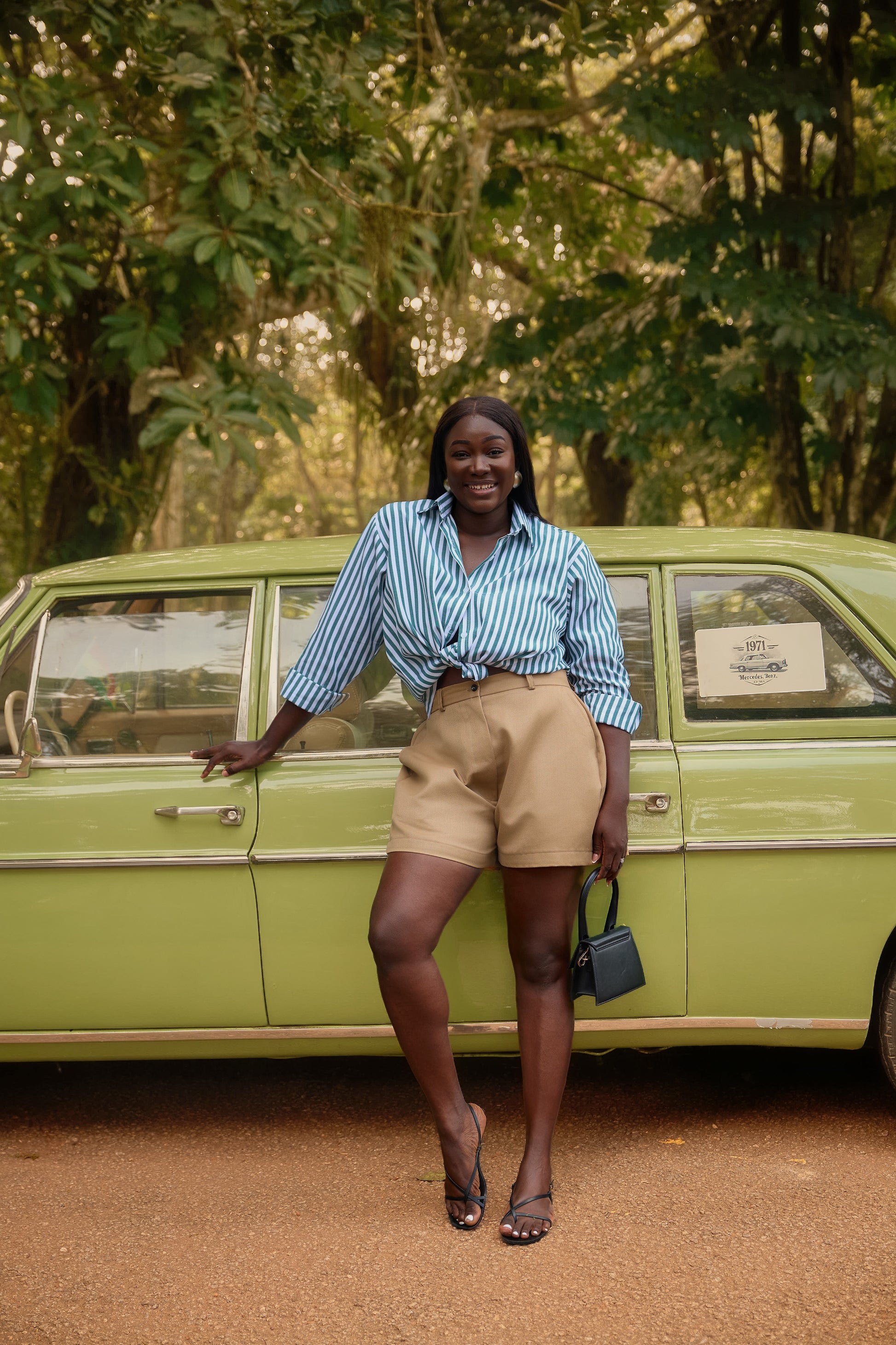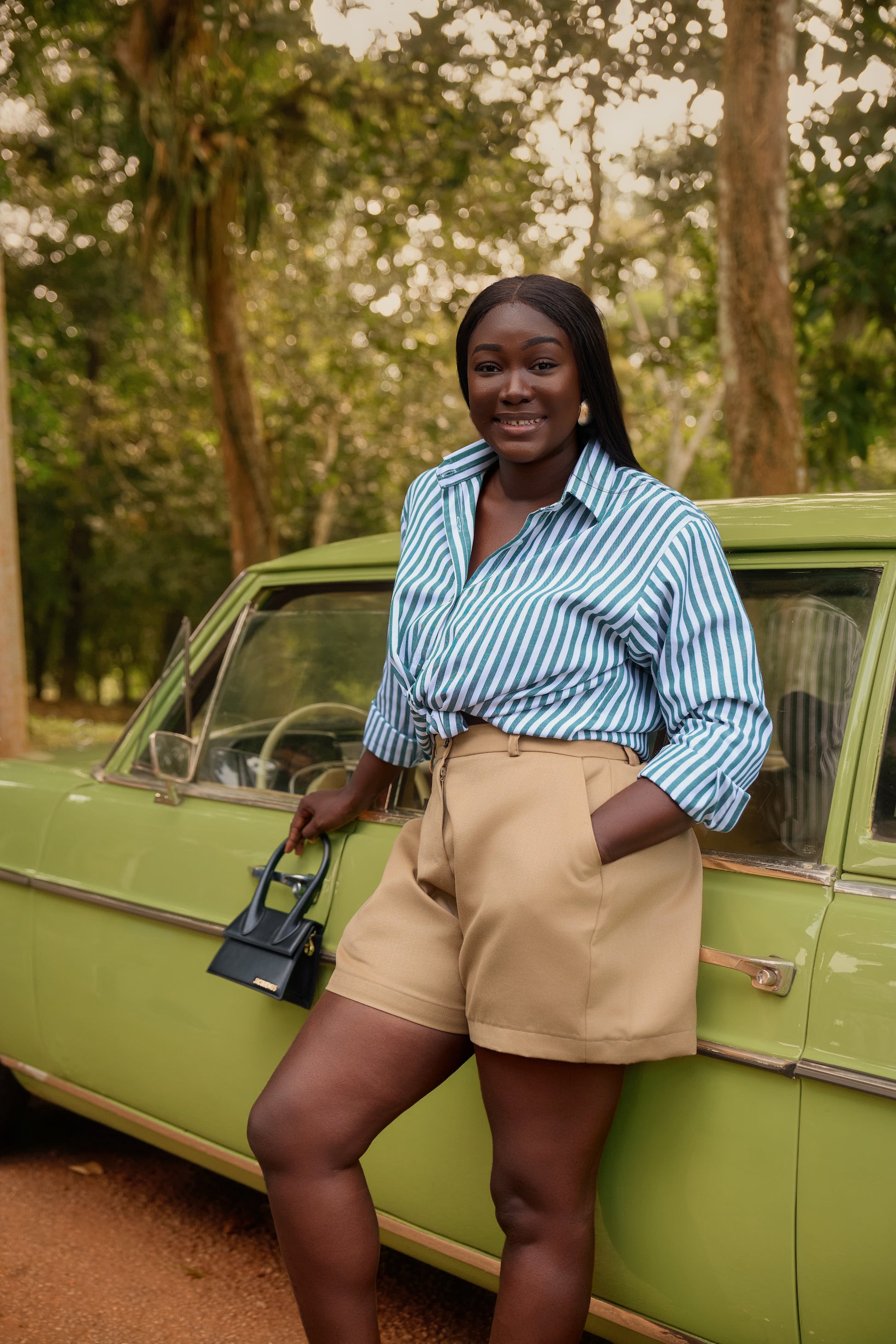 Green striped long sleeve shirt with dark khaki shorts to match. Shirt is made of a cotton blend fabric and the shorts are made of cotton fabric.